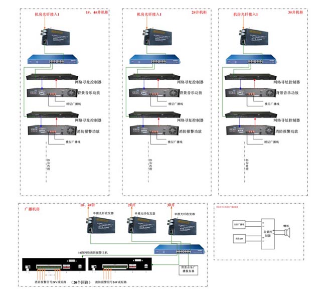 泰州碧桂園五星級大酒店位于江蘇省泰州市海陵區(qū)泰東河大橋北側(cè),地處生態(tài)旅游區(qū)。本次廣播設(shè)計(jì)安裝全金屬音箱1265只,按照功能分為40個(gè)區(qū)域,每個(gè)區(qū)域同時(shí)播放不同背景音樂;設(shè)置中心主控機(jī)房一個(gè),分中心機(jī)房4個(gè);廣播系統(tǒng)與酒店消防報(bào)警系統(tǒng)聯(lián)動(dòng)實(shí)現(xiàn)N-3、N-2、N-1、N、N+1、N+2、N+3報(bào)警。